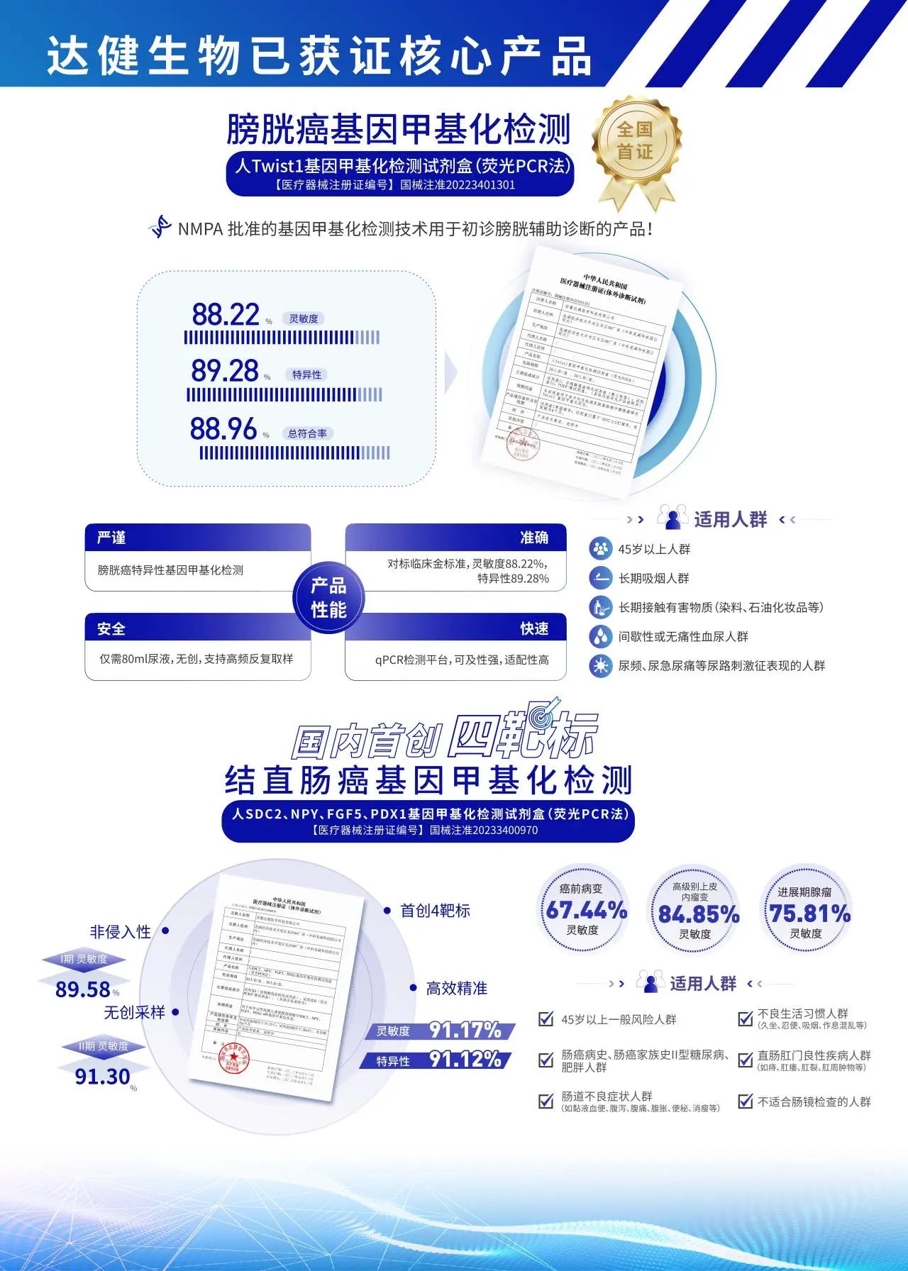 达健生物深耕肿瘤早诊领域多年,依托自主知识产权的“甲基化液体活检”技术平台,成功研发出多款癌症早期筛查产品,其中两款已获证产品包括: