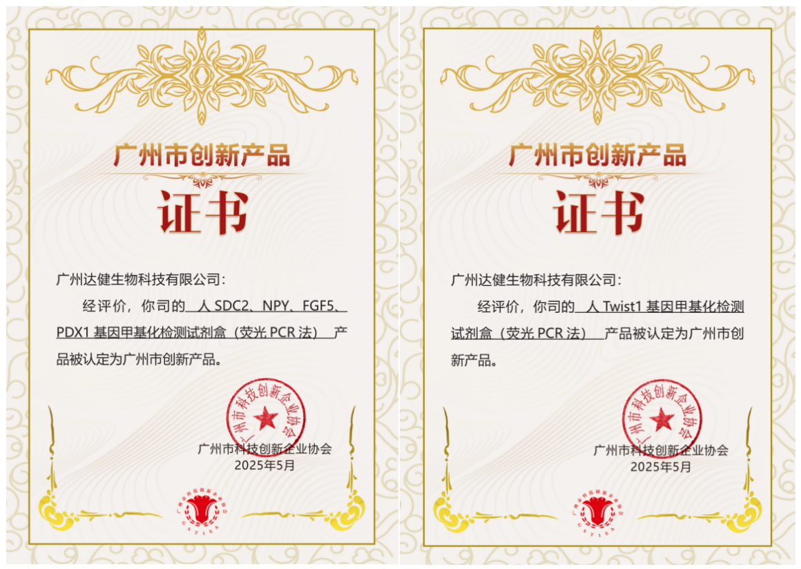 近日,广州市科技局指导、广州市科技创新企业协会主办的“2025年广州市创新产品目录”第一批征集活动结果正式揭晓。广州达健生物科技有限公司凭借其卓越的创新能力和领先的技术水平,成功将旗下两款核心产品——“人SDC2、NPY、FGF5、PDX1基因甲基化检测试剂盒(荧光PCR法)”与“人Twist1基因甲基化检测试剂盒(荧光PCR法)”纳入该目录。这不仅标志着达健生物在基因检测领域的创新成果得到了权威认可,更是对公司多年来专注于基因甲基化检测技术研发的肯定。
